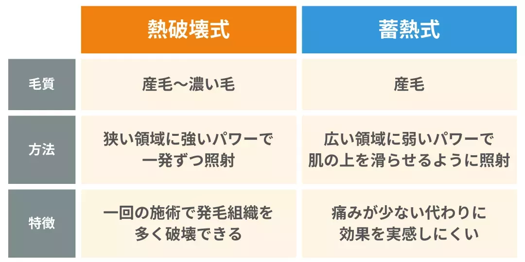 しかし「蓄熱式」は細い毛の脱毛効果が期待できるため、顔などの産毛が多い箇所の施術に向いています。