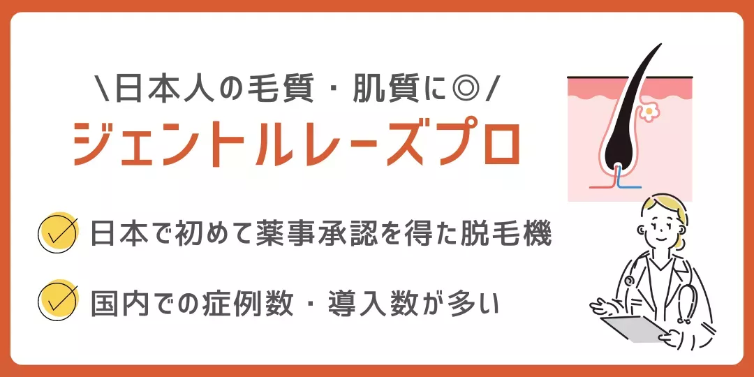「ジェントルレーズプロ」は、日本で初めて薬事承認を取得した脱毛機です。ジェントルシリーズは、日本で20年以上使用されており、国内での症例数が多いのが特徴です。