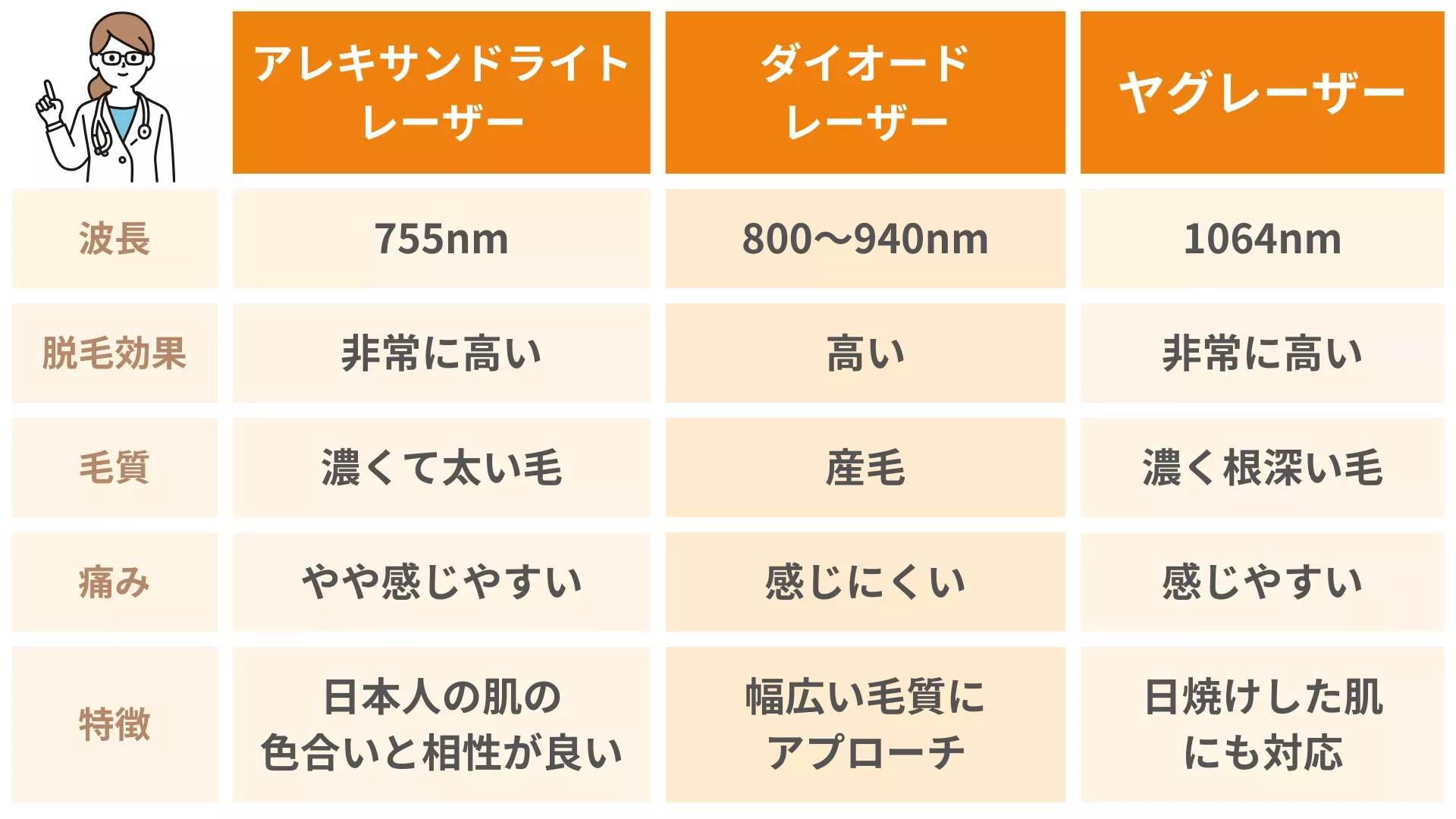レーザーの長さによって効果を期待しやすい毛質が異なる