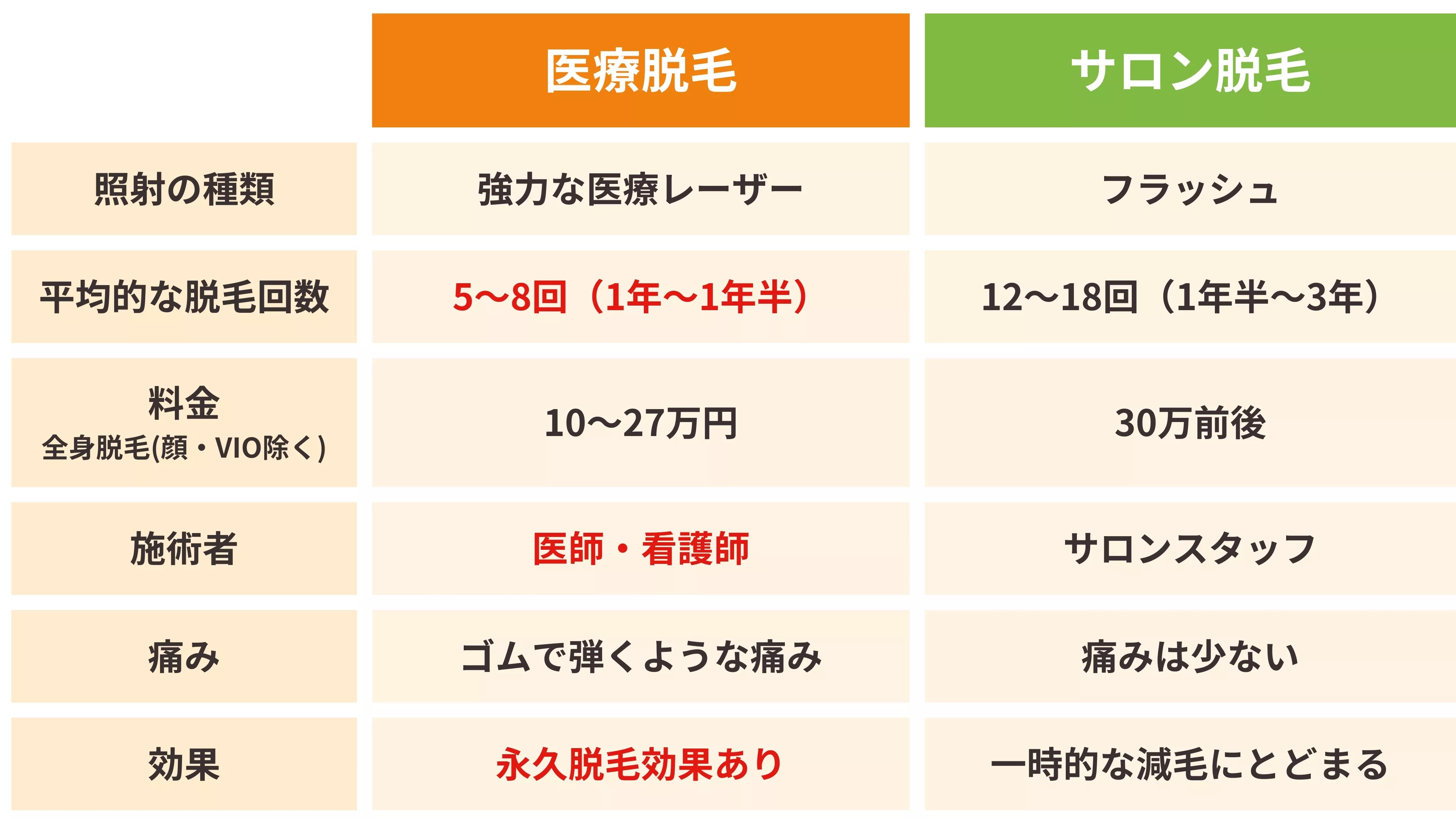 一方、サロン脱毛は毛を生やす組織を破壊しないため、一時的な減毛・抑毛効果にとどまります。