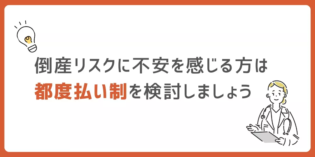 最近は、前払いのコース制ではなく、都度払い制を導入したクリニックも増えてきましたので、倒産リスクが心配な方はぜひ検討してみてください。