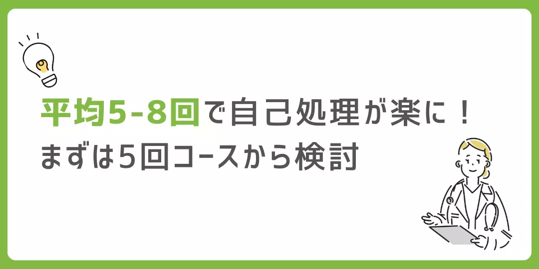 平均5〜8回(1年~1年半)で自己処理が楽になったといった声が多いです。まずは5回コースを契約して、物足りなければ追加するのがおすすめです。