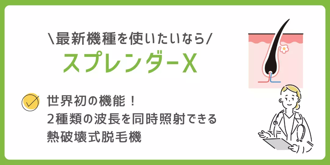 「スプレンダーX」は2019年に開発された2種類の波長を同時に照射することができる国内初の承認医療脱毛機です。ジェントルシリーズは、波長を切り替えて脱毛をするのに対し、「スプレンダーX」は波長を混合し長さの異なる波長を同時に照射することができます。