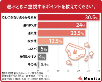 「新生オムツを選ぶときのポイント」を200人にアンケートした結果、「ごわつかない柔らかな素材」が最も多く、「漏れにくさ」や「通気性」が続いて選ばれていました。パパ・ママが赤ちゃんが快適に過ごせるように意識しているのがよく分かります。