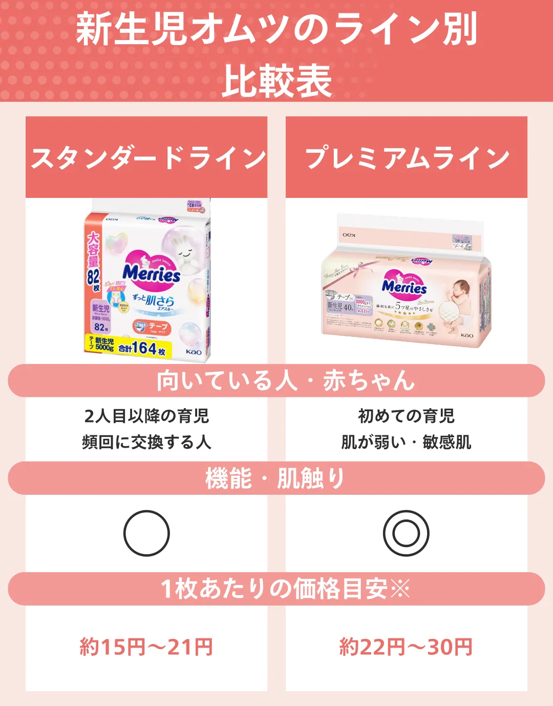 はじめての肌へのいちばん ウルトラジャンボ パンパース | ![]() | Amazon楽天ヤフー | 値段も安く羽毛のようなふわふわ感が魅力的 | 誕生〜3kg | 24枚 | 22円 |