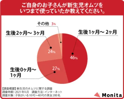 「新生児のオムツをいつまで使っていたか」のアンケートでは、生後1ヶ月〜2ヶ月が半数近くを占めていました。新生児オムツを卒業するタイミングに悩まれている方は、ぜひ参考にしてみてください。
