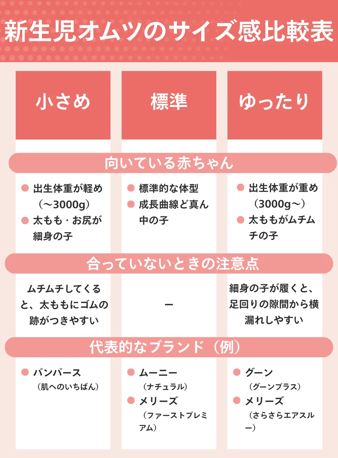 「新生児用(〜5kg)」などの表記はあくまで目安です。赤ちゃんの体型は千差万別で、体重だけで選ぶと漏れの原因になります。
