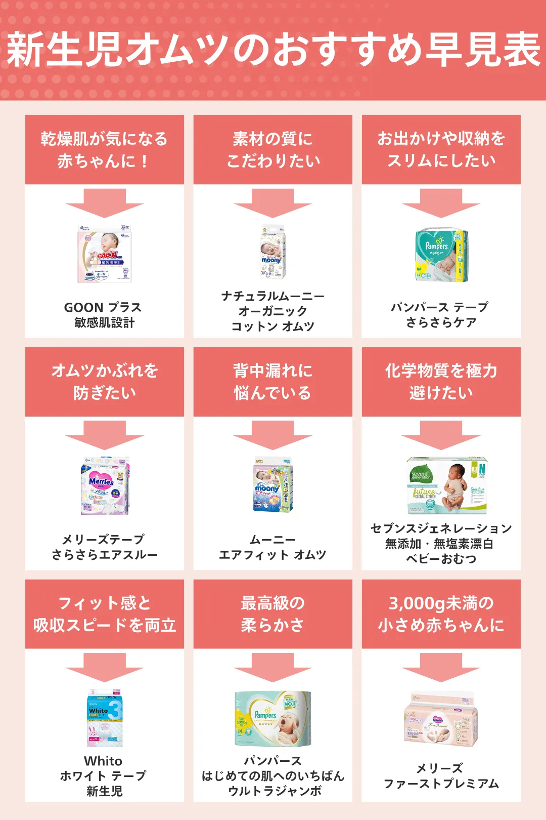 「初めての育児で肌トラブルが心配」「ゆるうんちの背中漏れをどうしても防ぎたい」などの悩みを明確にすると、選ぶべき商品は自然と絞られてきます。