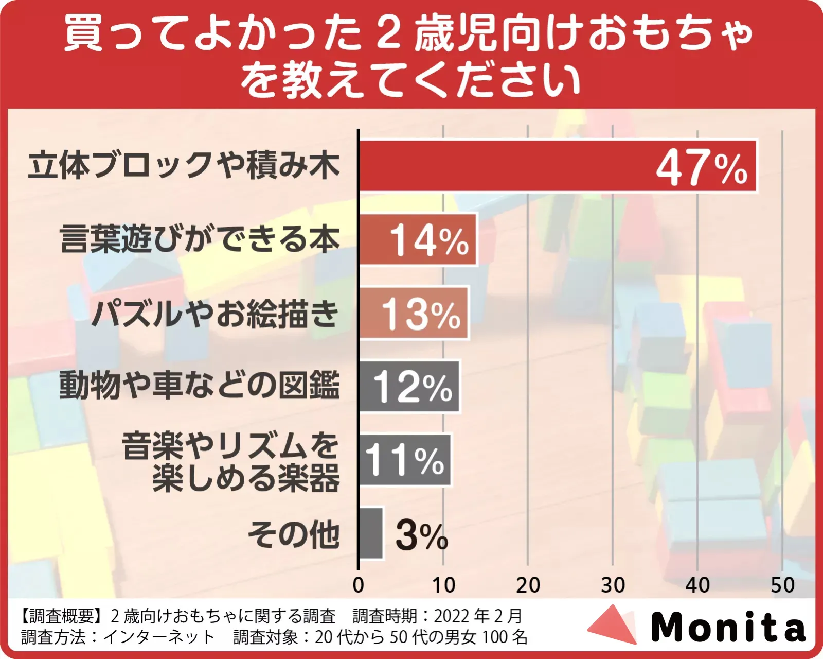 アンケートではまず2歳児に買ってよかったおもちゃのジャンルをお伺いしました。その結果1位は「立体(ブロック・つみき)」で47%と半数近くとなります。次いで2位は「言語(本)」で14%、3位は「想像(パズル・お絵描き)」で13%となりました。