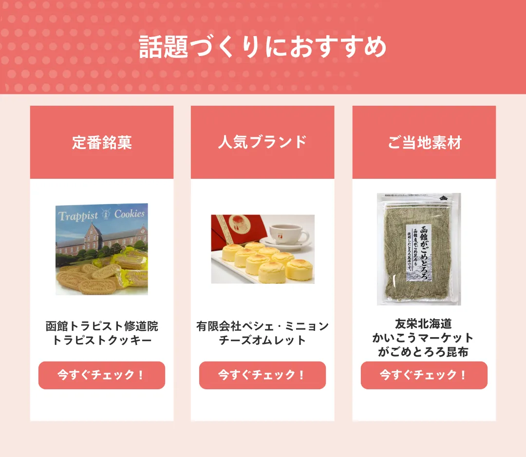 例えば、ビール好きの方には、ご当地限定のしょっぱい系ポテトチップスやスナック菓子がおすすめです。また、ワイン好きにはチーズ製品、ソーセージ・サラミ、燻製。日本酒好きには海鮮珍味や缶詰を検討してみてください。