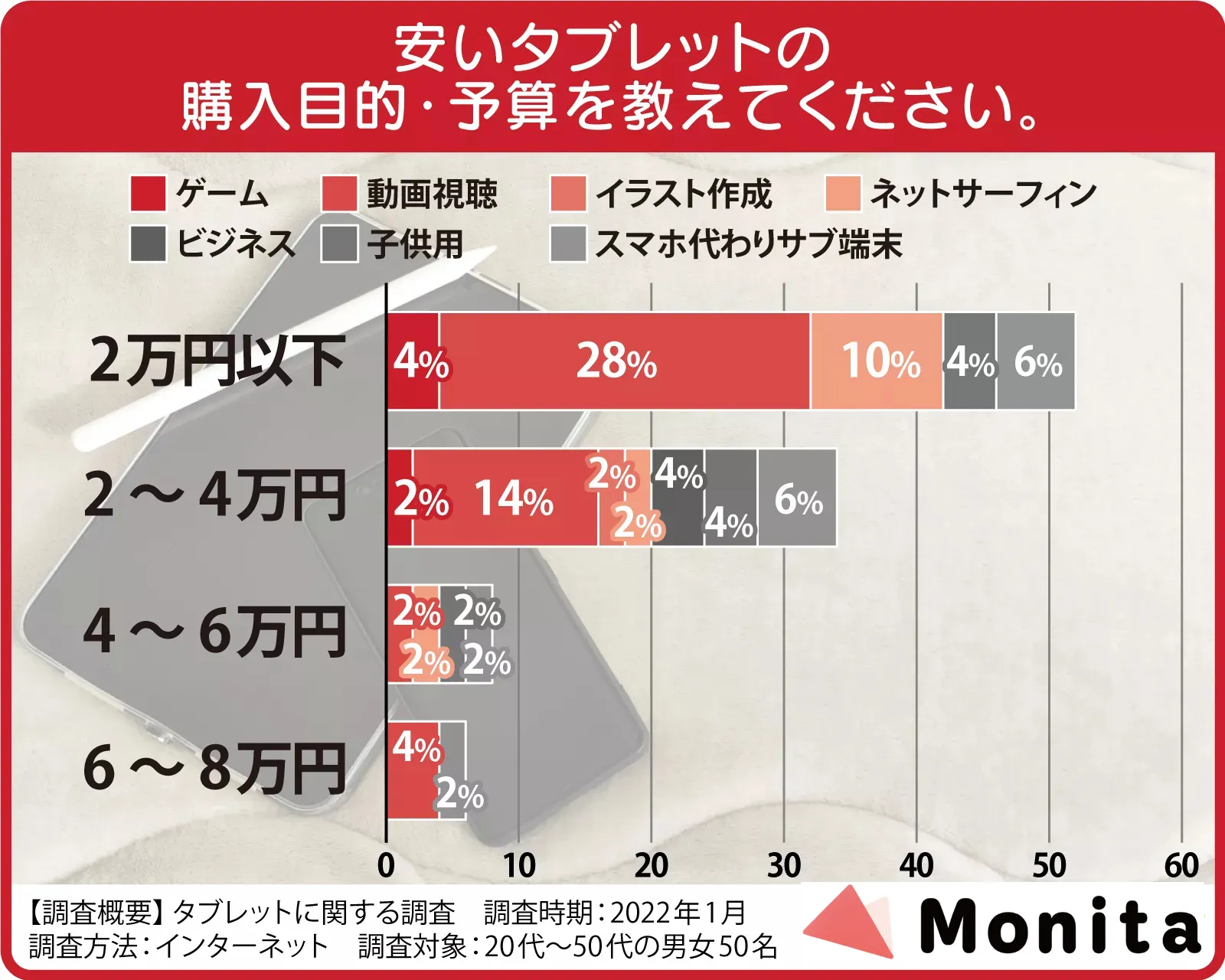 アンケートでタブレットの購入目的と予算を調査したところ、購入目的では動画視聴が1位、予算では2万円以内が1位結果でした。動画見るだけなら2万円以内のタブレットを購入し十分に満足できています。