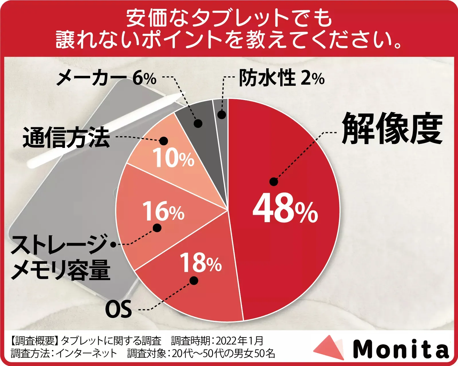 タブレットを購入する方が何を一番重要視しているのか調査を行ったところ、半分近くの方が液晶の解像度を一番重視している回答でした。動画を鮮明な映像で楽しみたいなら、解像度にはこだわりたいところです。
