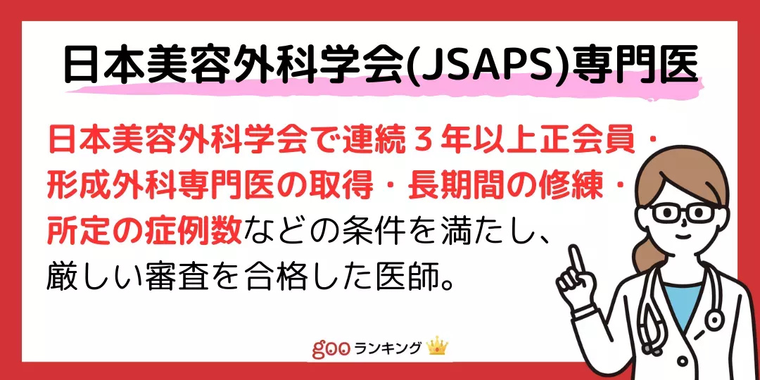 æ¥æ¬çŸå®¹å€ç§åŠäŒïŒJSAPSïŒãèªå®ããè³æ Œã¯ãçŸå®¹ç®çã®æè¡ã«ç¹åããå°éå»ã®èšŒã§ããååãšããŠãŸã圢æå€ç§å°éå»ïŒJSPRSïŒãååŸããŠããããšãæ±ããããããé«åºŠã§å°éçãªçŸå®¹å€ç§ã®ç¥èãæè¡ãæã€å»åž«ã«èªå®ãããŸãã圢æå€ç§ã§å¹ã£ãå建æè¡ã«å ããçŸå®¹ç®çæ²»çã®çµéšãåŠè¡æŽ»åãå³ãã詊éšã«åæ Œããå»åž«ã«äžããããäžäœè³æ Œã§ããåå»ãšåŒã°ããå»åž«ã®å€ãã¯æ¥æ¬çŸå®¹å€ç§åŠäŒïŒJSAPSïŒã®è³æ Œãä¿æããŠããŸãã