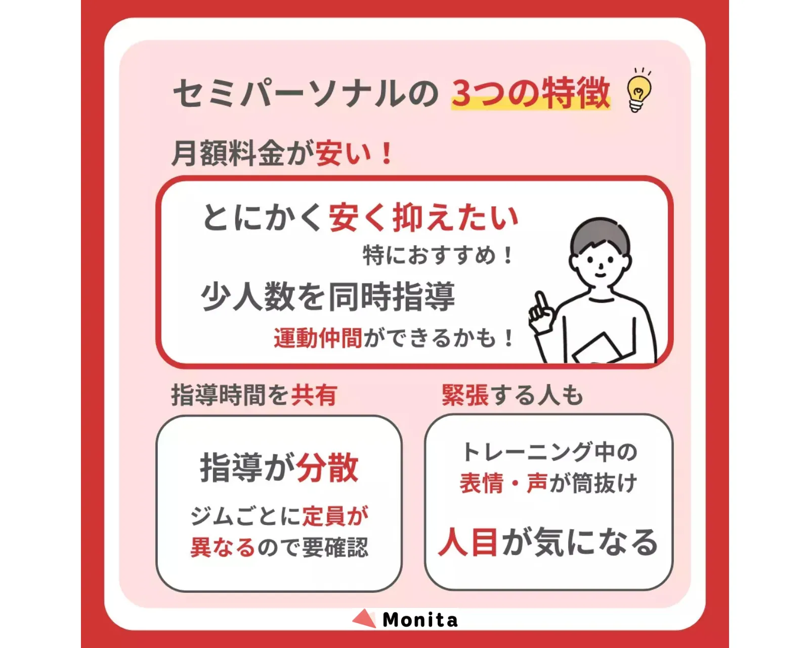 たとえば、通常のパーソナルジムではトレーナーがマンツーマンで指導してくれますが、セミパーソナルジムでは複数人を同時に指導します。結果的に一人あたりにかける時間が減り、トレーナーの指導時間が分散してしまいます。セミパーソナルジムの中でもジムによって定員に差があるので、なるべく十分なサポートを受けられるジムを選びましょう。