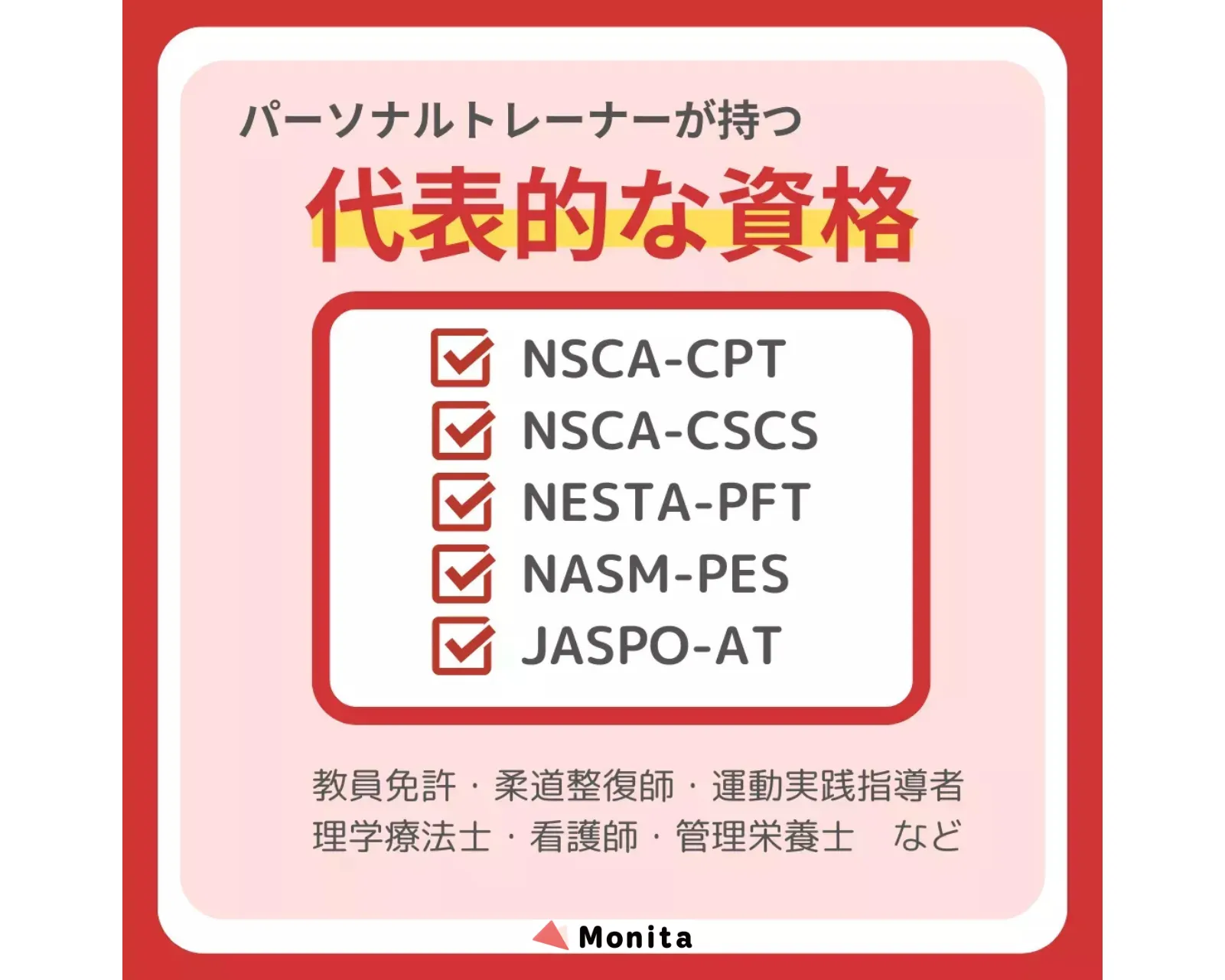 トレーニングを始める前に、どのようなトレーナーが自分に合っているか判断するのは難しいものです。正しい知識を持ったトレーナーの一例として、NSCA(※1)やNESTA(※2)などの認定資格を保持していることも比較する上での目安になります。