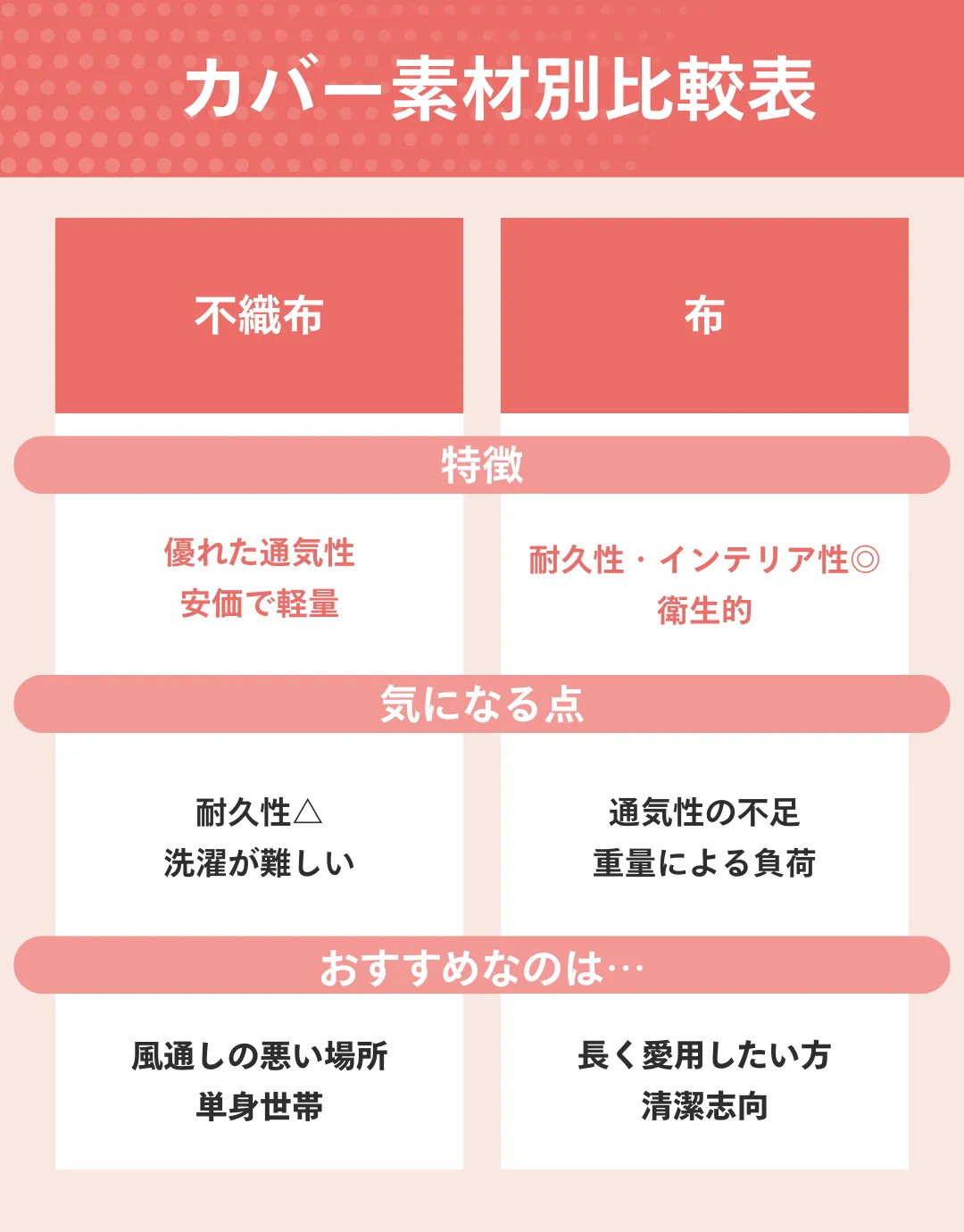 一方で、布製と比較すると耐久性がやや劣り、洗濯が難しいという側面もありますが、安価で軽量なため、定期的に交換して清潔を保ちたい層には非常に適しています。防塵性能も十分に備えているため、オープンラックをクローゼット代わりに使用している単身世帯や、風通しの悪い北側の部屋にラックを設置している家庭にとって、不織布は最もバランスの取れた選択肢と言えます。