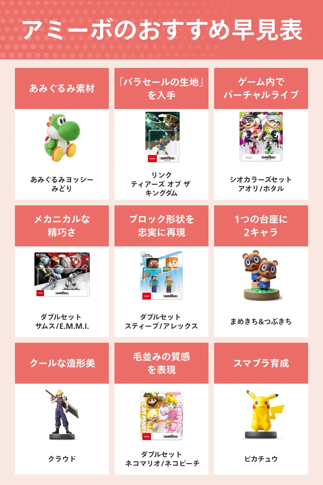 今回は、アミーボの選び方や使い方と合わせて、マイクラやスプラトゥーンなどのおすすめ15選をご紹介します。アミーボでできること、何に使うか、アミーボの効果は?どれがいいの?などの疑問も解説していくので、ぜひ最後までご覧ください。