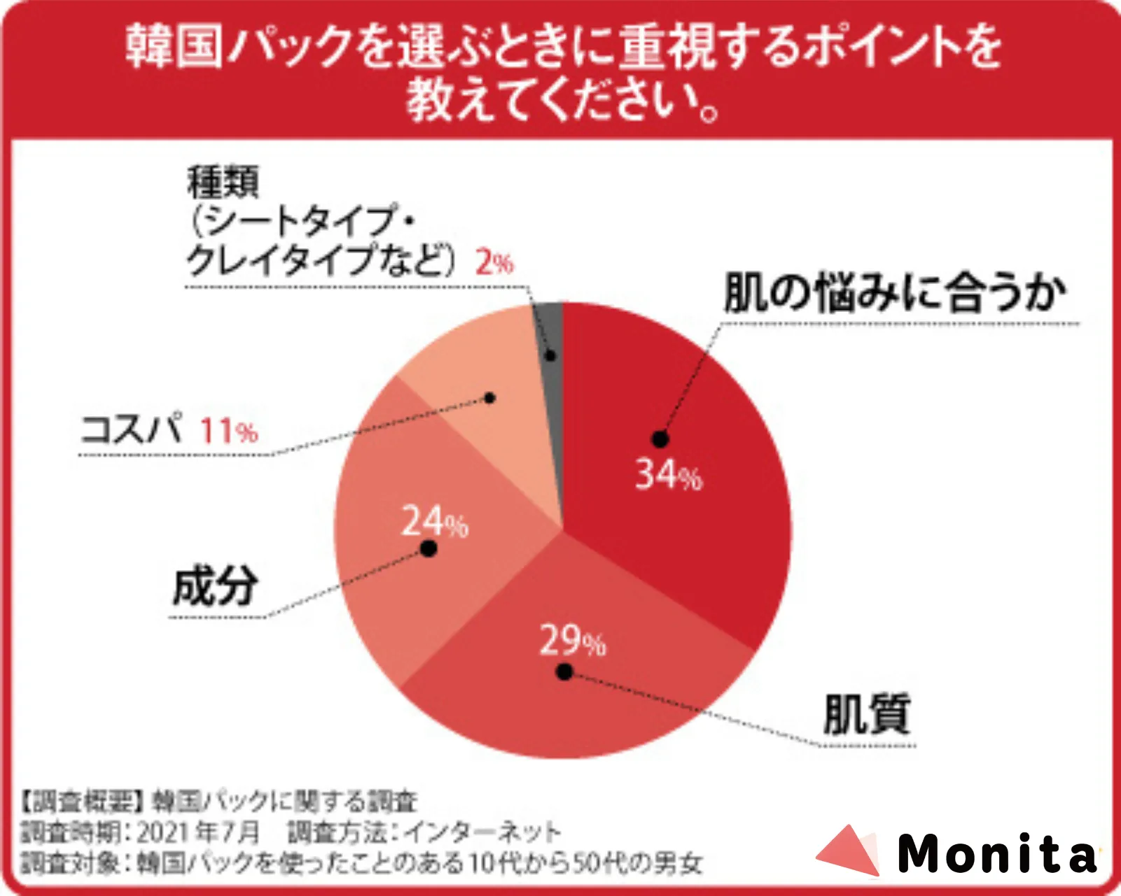 韓国パックを選ぶときにチェックするポイントを100人にアンケートした結果、肌の悩みに合うか・肌質が最も多く票を集めました。パックは肌に直接触れるものなので、使用前に必ずパッチテストを行ってから使用するようにしてください。