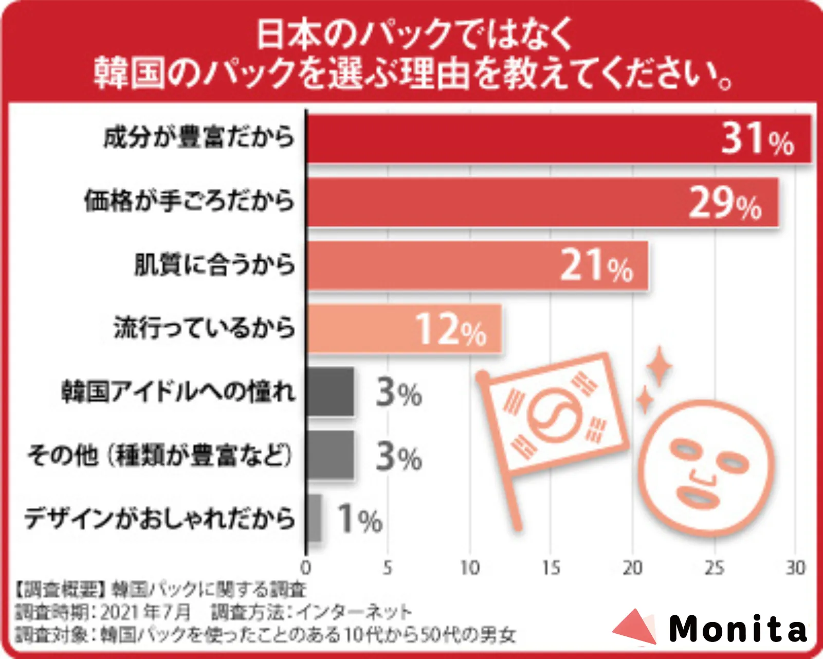韓国パックを選ぶ理由を調査した結果、成分の豊富さと価格の手ごろさが最も多く票を集めていました。頻繁に使用するからこそ成分とお手軽さは大切なポイントになります。ほかの回答では、流行っているから・韓国アイドルに憧れているからなども選択されていました。