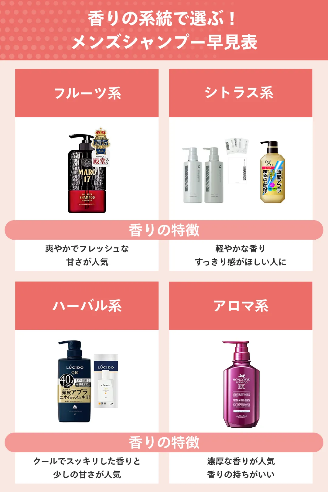 メンズシャンプーでは、サボン系やムスク系の香りのシャンプーを多くラインナップしています。さっぱりした香りやウッディな香りが好きな方に特におすすめです。