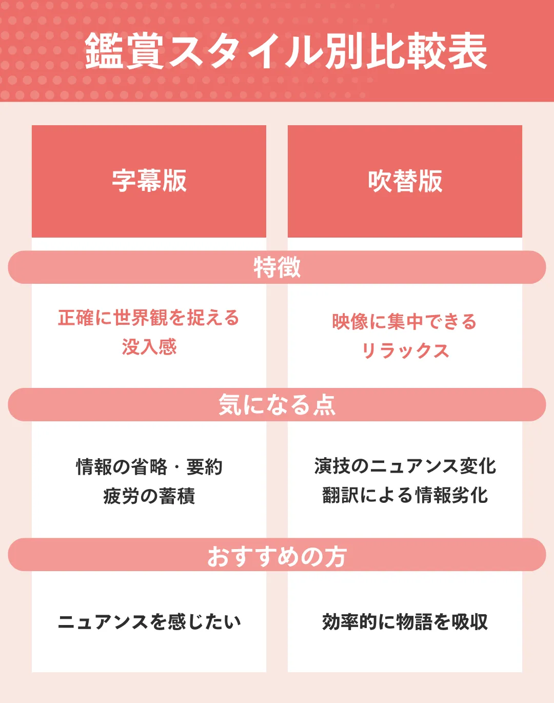 映像そのものの細部や俳優の表情に集中できるため、字幕を目で追うストレスから解放され、よりリラックスした状態で映画を楽しめます。忙しいスケジュールの中で、効率的に物語を吸収したい人にとって、吹替版は極めて実用的な選択肢と言えるでしょう。