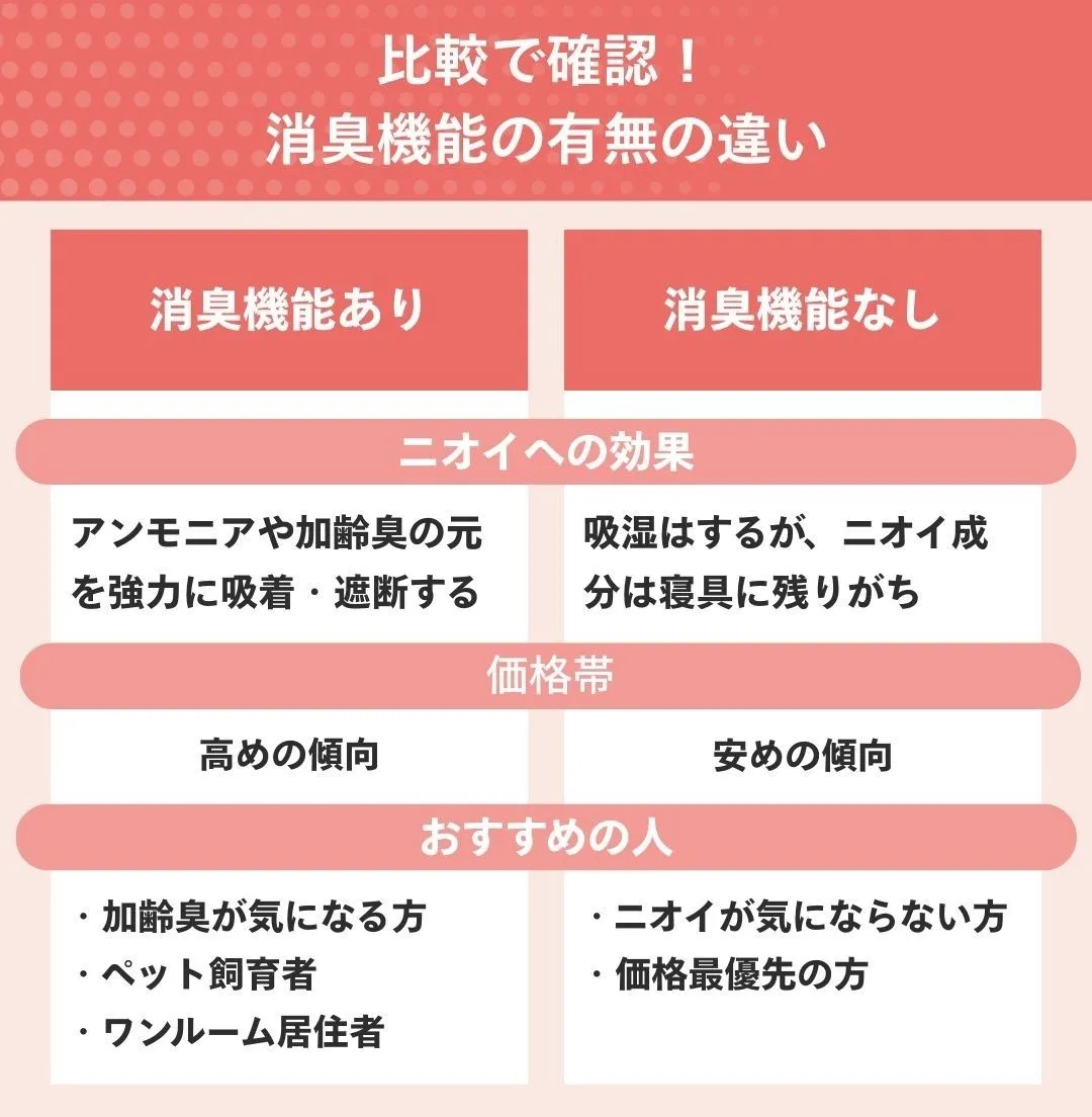 湿気の問題と密接に関係しているのが、寝具に染み付く独特のニオイです。不快な臭気は睡眠の質を低下させる原因となりますが、消臭成分を配合した製品を選べば、吸湿と同時に空気を浄化する効果が期待できます。エチケットとしてニオイ対策を徹底したい方や、来客時に寝室の空気が気になる方にとって、消臭機能は欠かせない要素です。