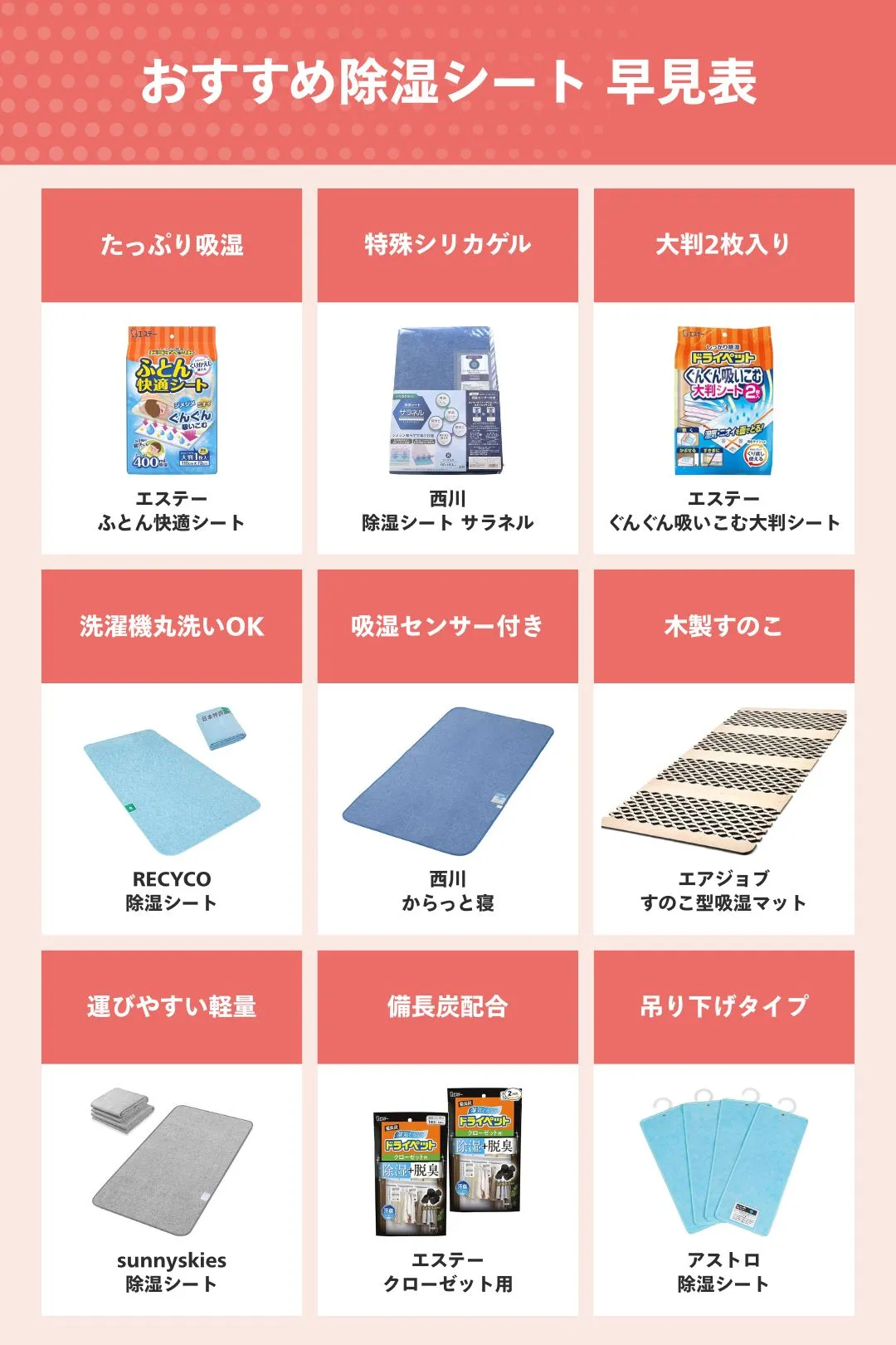 そのほかにも除湿シートには吸湿センサー付きや洗えるもの、速乾性のあるものなどさまざまな機能付き商品があります。記事の後半で詳しくご紹介しますが、先に見たい方は以下のボタンをクリックしてご覧ください。
