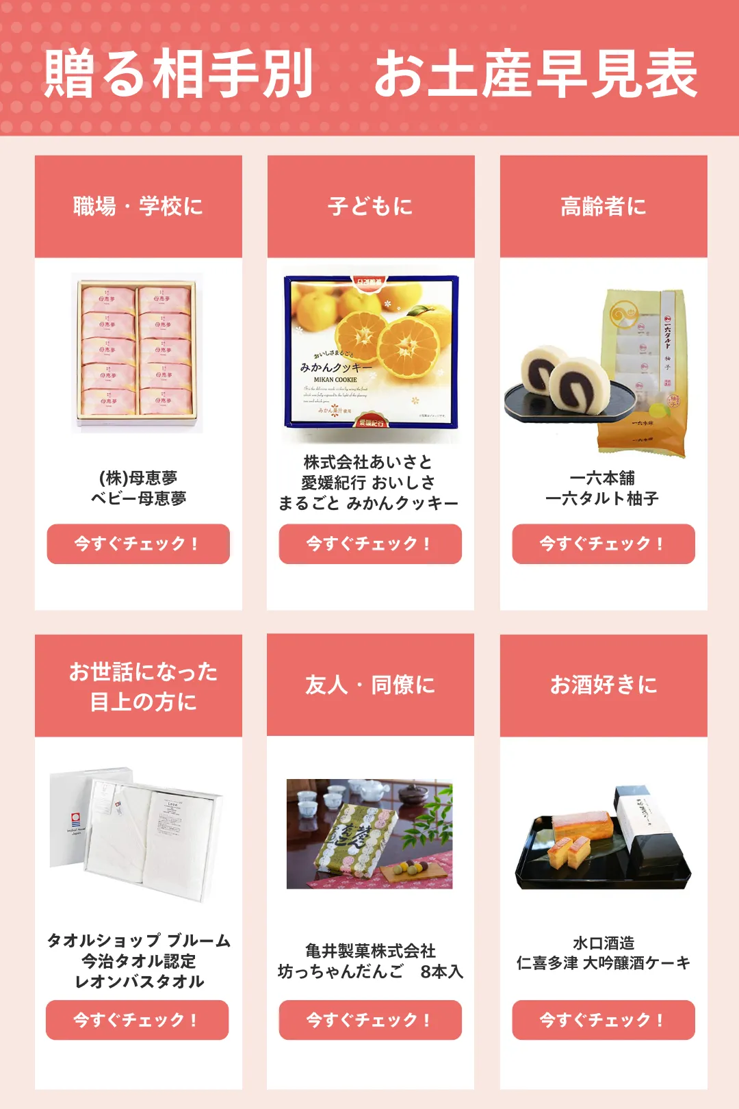 第5位 ベビー母恵夢 愛媛のせとか 母恵夢本舗 | ![]() | Amazon | 愛媛の特産品であるみかんを使った人気銘菓 | 10個 | 和洋菓子 | ○ |