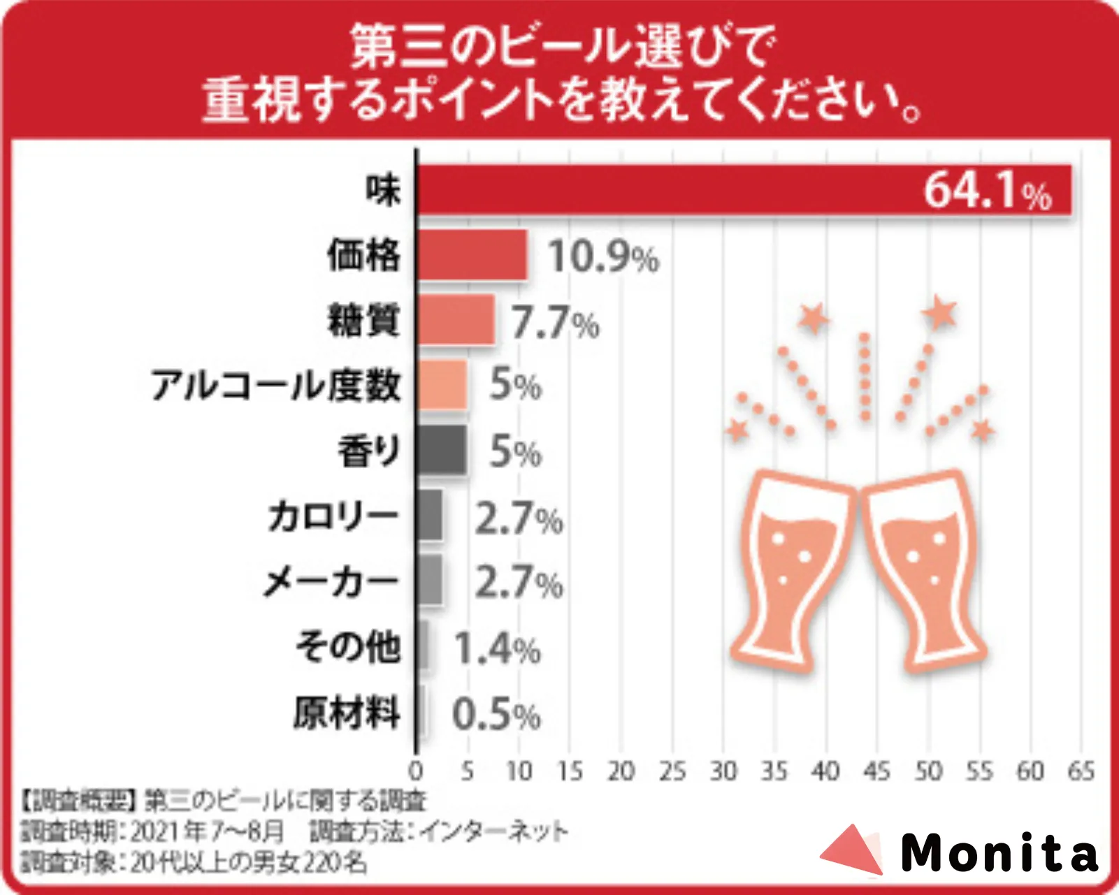 アンケートでは、おすすめの第三のビールに加えて、美味しい第三のビールを選ぶうえで重視するポイントについても調査しました。64%と半数以上の方が「味」と回答していました。価格を抑えているとはいえ、味は譲れないポイントです。