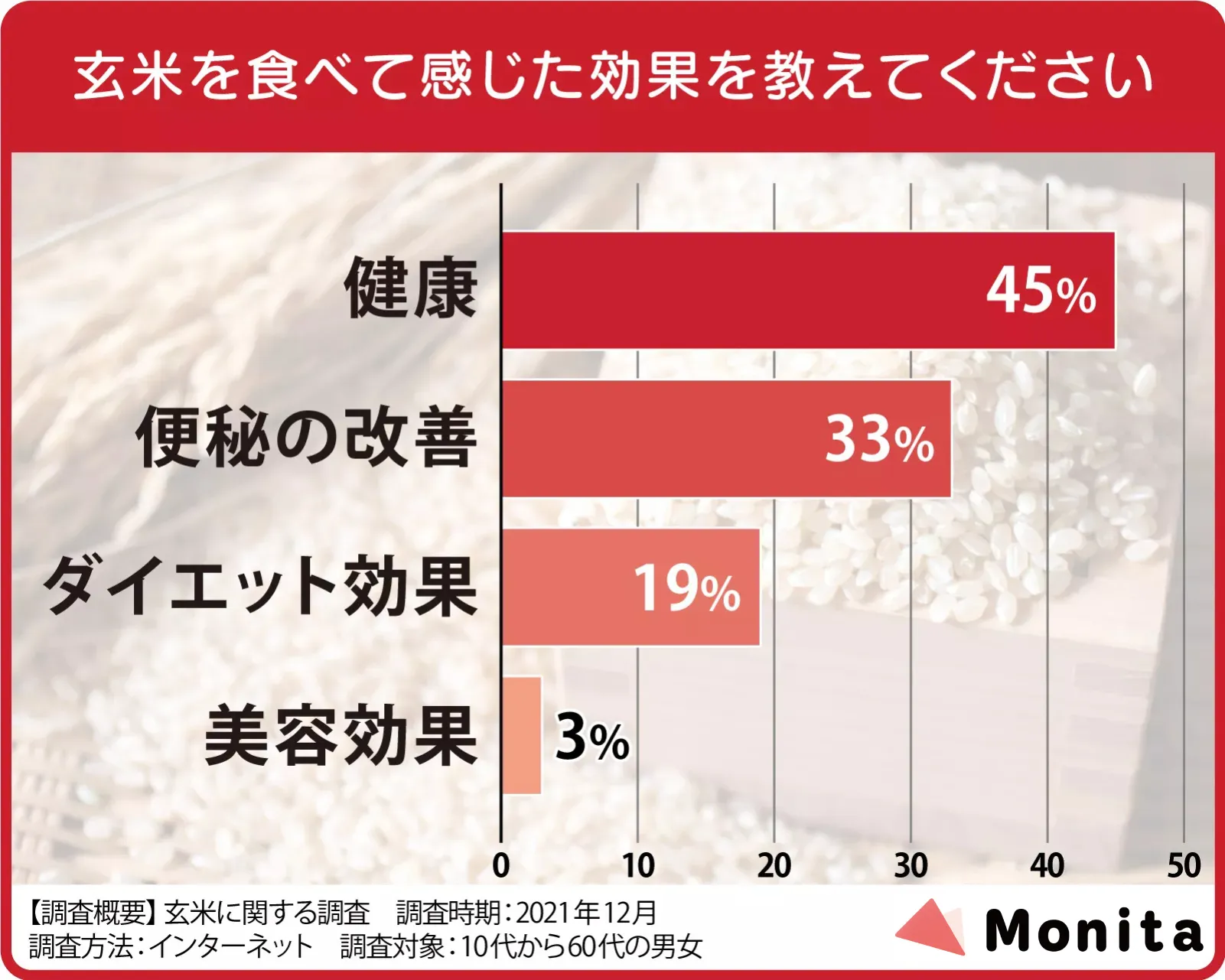今回のアンケートでは玄米好きの方々に玄米食に変えたら感じた効果についても調査しました。その結果第1位は「健康」で半数近くを占め、次いで「便秘の改善」「ダイエット効果」と続いています。