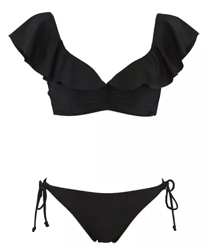 肩にフリルが付いたおしゃれデザインのビキニタイプの商品です。ニットでできている水着なので、ほかの方と少し違った個性的な商品が欲しい方にもおすすめできます。フロントのレースアップでサイズ調節できるのもポイントです。