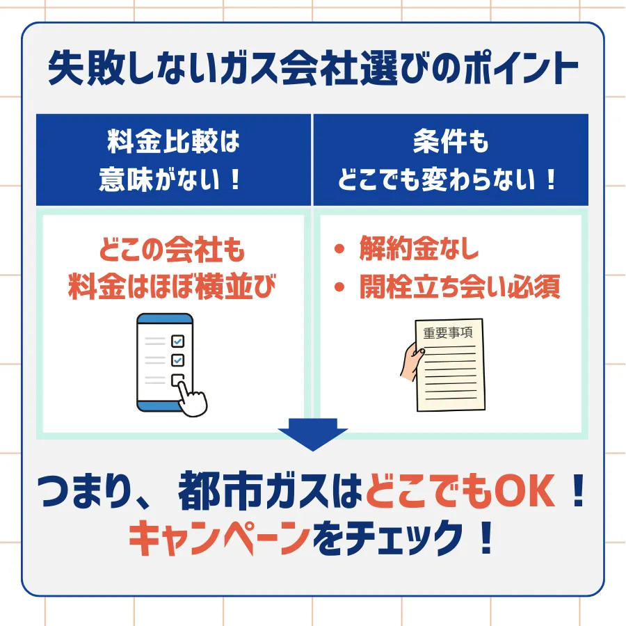 まとめると、都市ガスの場合は会社を変えても大きな失敗はしないため、比較的柔軟に会社の変更ができます。