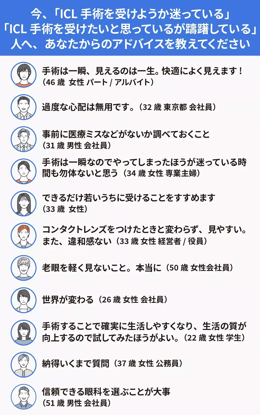 gooランキング編集部がICL経験者を対象に実施した独自アンケートでは、「今、ICL手術を受けようか迷っている・受けたいと思っているが躊躇している人へ、あなたからのアドバイスを教えてください」という質問をしました。ここでは、その回答を一部抜粋し紹介します。