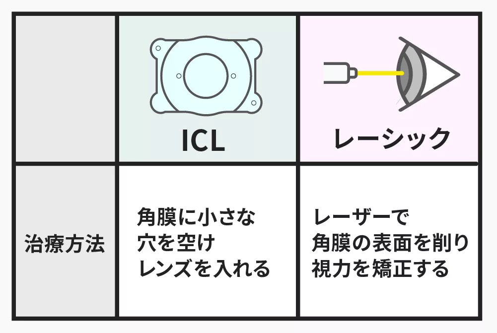 レーシックは軽度〜中程度の近視が対象で、ICLは強度近視が対象
