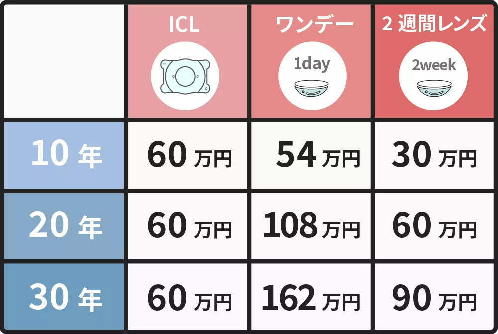 前述した通り、ICL手術にかかる費用は450,000~800,000円と決して安い金額ではありません。しかし、一度手術をしてしまえば10年、20年とコンタクトレンズの定期購入にかかり続ける費用と比べるとICLは経済的ともいえます。仮にワンデーのコンタクトレンズを1日あたり150円程度の費用がかかるとします。2週間レンズなら1日あたり50円程度と1ヶ月あたり1,000円程度のケア用品がかかるとします。30年後までにかかる費用を計算すると、なんとワンデーコンタクトレンズなら162万円、2週間レンズなら90万円にも上る計算になります。
