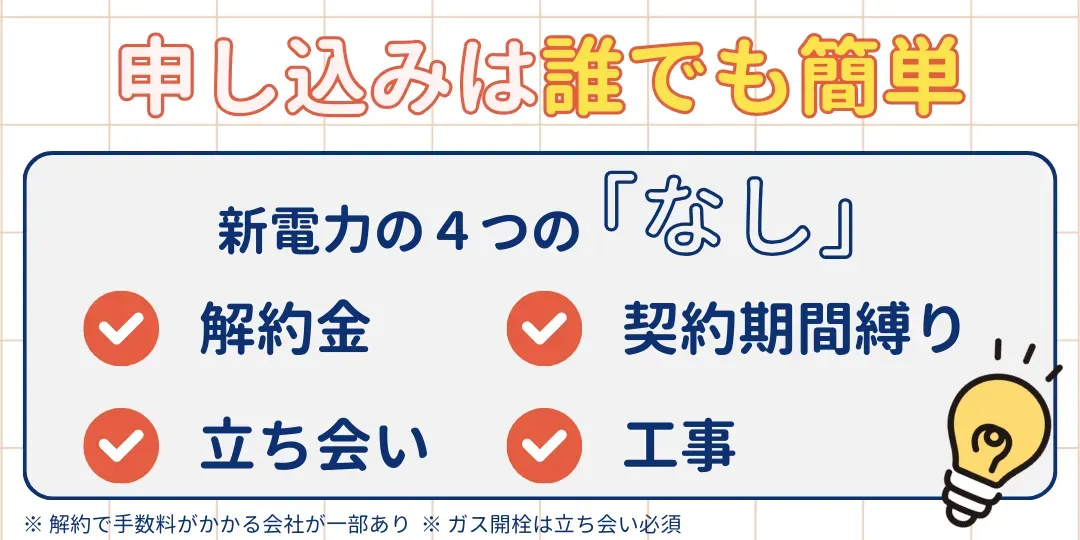 電力会社の契約はとても簡単で、申し込みも5分程度で完了します。多くの会社で解約金もないため、気軽に申し込みできますよ。