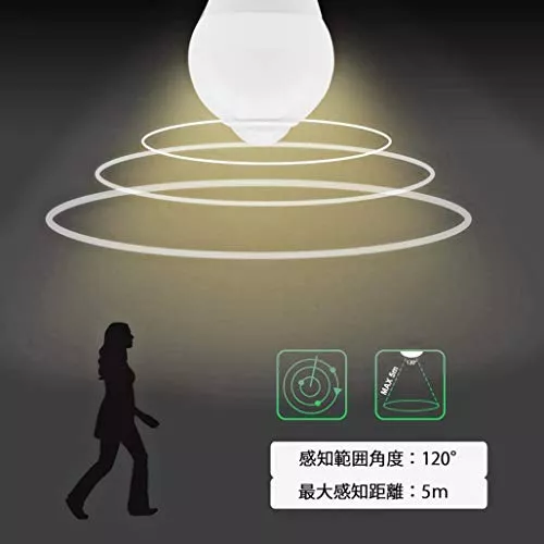 感知範囲が約5mもある小型のセンサー付き電球です。人がいなくなると120秒で消灯し、従来型よりも1ヶ月の電気代は約7分の1に抑えられます。光源寿命は25000時間もあり、電球を付けたり消したりしても影響はありません。