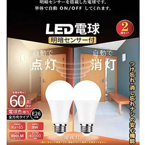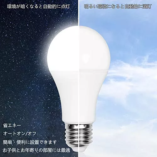 密閉型対応なのでカバー付きの照明器具にも取り付けできる光センサー内蔵のLED電球です。周囲の光を自動で感知し、暗くなれば自動で点灯、明るくなると自動で消灯する明暗センサー仕様になっています。周囲が暗ければ10分以上の点灯も可能です。