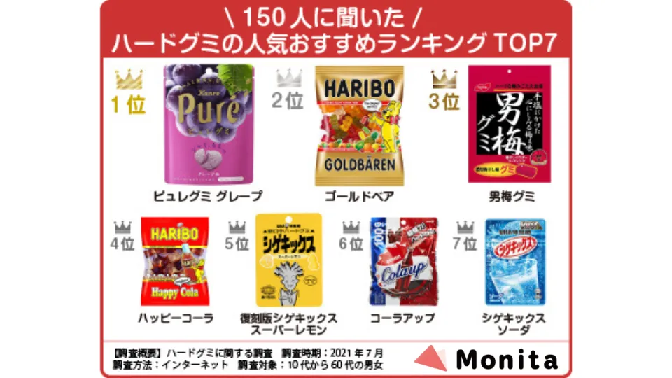 ハードグミ・硬いグミには、味も酸っぱいグミや太りずらい・甘くないグミ、しっかりとした噛みごたえの超ハードグミなど種類が豊富なので選ぶのに迷う方も多いです。そこで今回は150人を対象にしたアンケートをもとにおすすめランキングをご紹介します。
