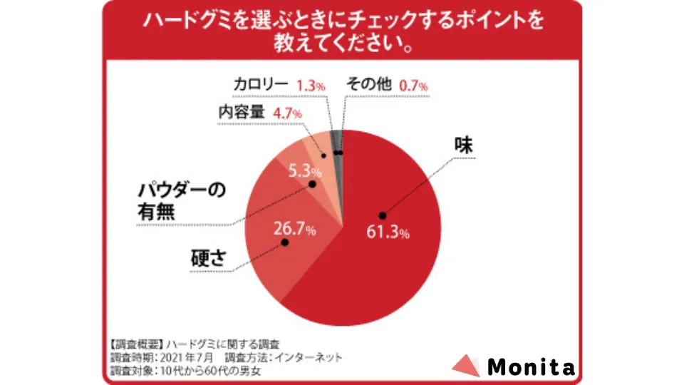 ハードグミを選ぶときにチェックするポイントを150人にアンケートした結果、「味」が6割以上の票を集める結果になりました。味以外あまり意識しない方が多いのが、現状のようです。ダイエット中の方はカロリーをチェックしてください。