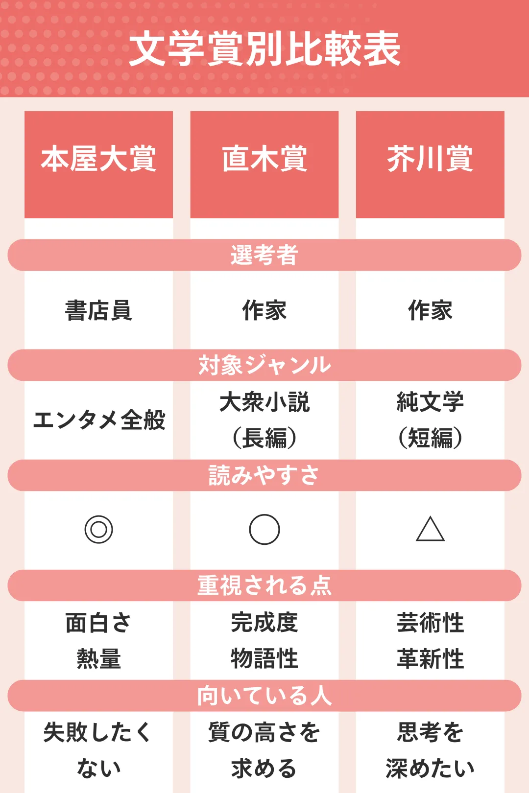 純文学に触れたい方や、現代的なテーマについて深く考えたい方に向いています。 ストーリーの面白さ以上に、文章表現の美しさや、社会の不条理・人間の実存といった深いテーマが重視されます。思考を深める読書体験を求めている方に適した賞です。