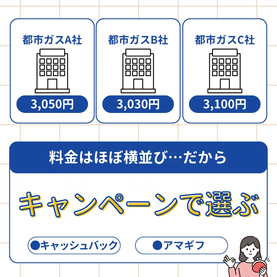 というのも、都市ガスは会社間の料金の差が少ないため、やはりチェックすべきはキャンペーンです。