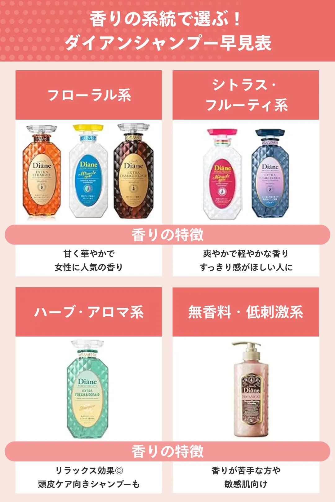 ダイアンでは、フローラル系の香りのシャンプーを多くラインナップしています。花を連想するような、甘くて華やかな香りが好きな方に特におすすめです。