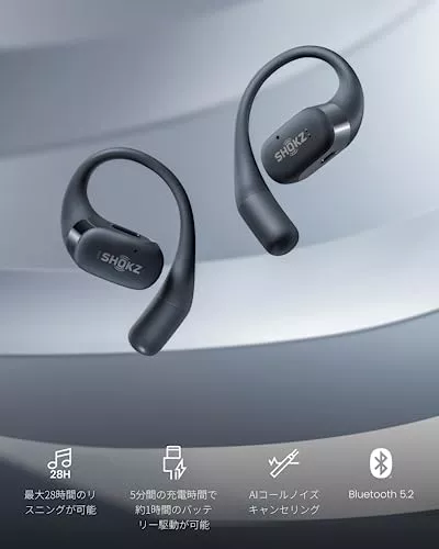 耳を塞がない骨伝導イヤホンで、周囲の音も聞けます。フィット感に優れており、ランニング中でも落とさずに使用できます。IPX7の防水性能を持ち、雨の日のトレーニングでも使用できます。最大約5時間の連続使用にも対応しています。