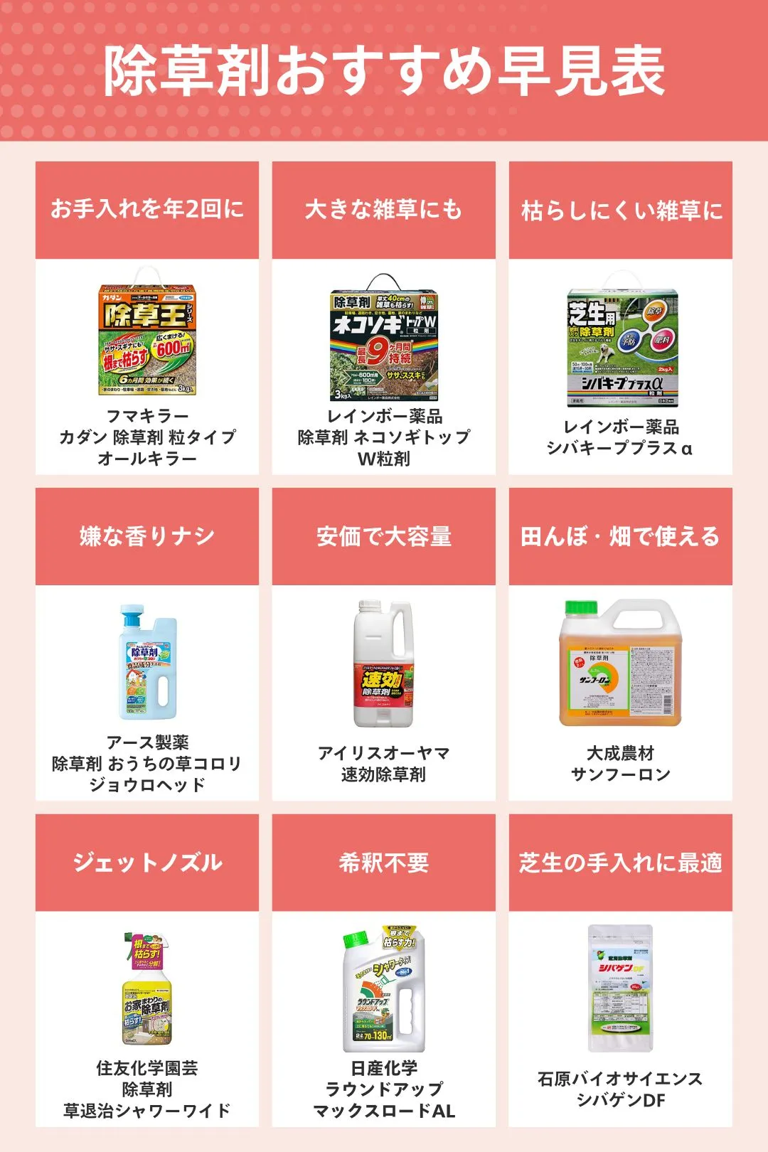 | 商品名 | 画像 | 購入サイト | 特徴 | タイプ | 対象 | 農薬登録 | 選択性 |