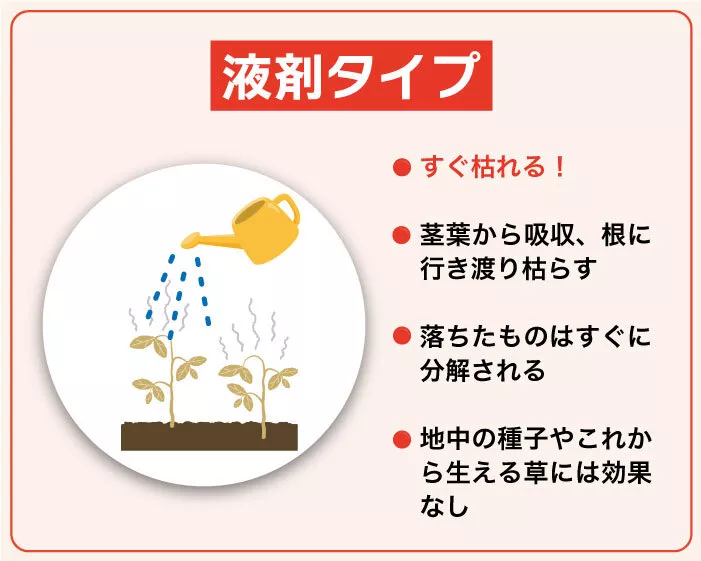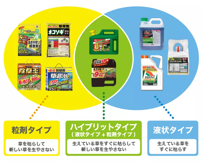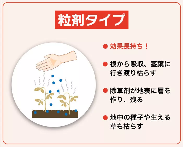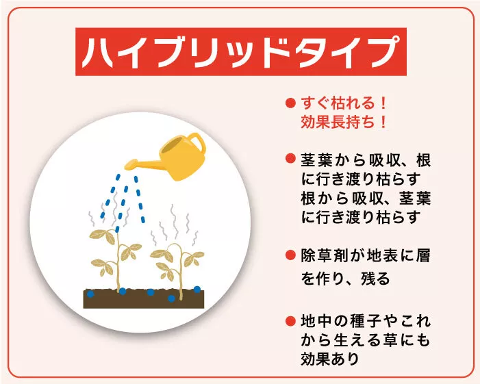 特徴/除草剤のタイプ | 粒剤タイプ (土壌処理剤) | 液剤タイプ (茎葉処理剤) | ハイブリッドタイプ |
