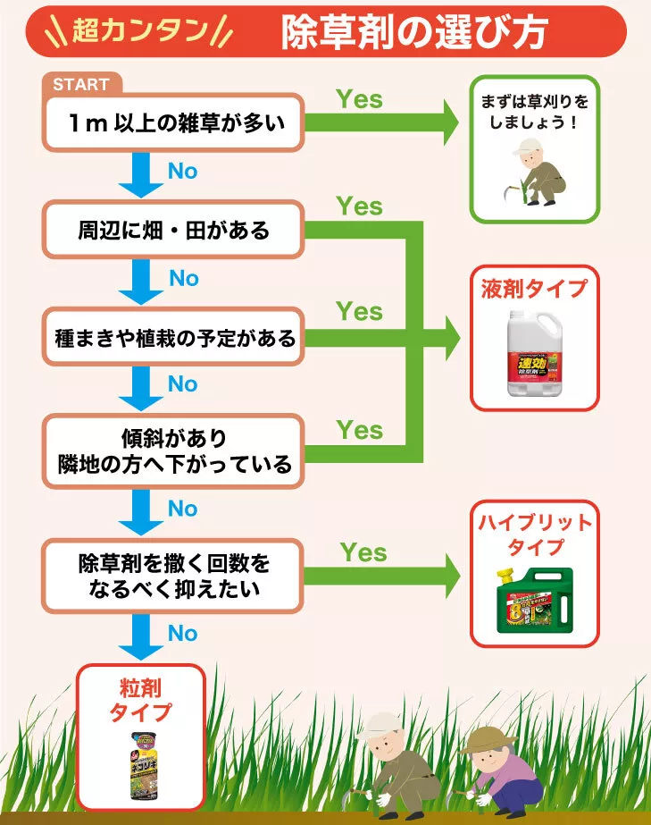 数が多くてどの除草剤がいいのかわからない方は、下のフローチャートを参考にしてみましょう。
