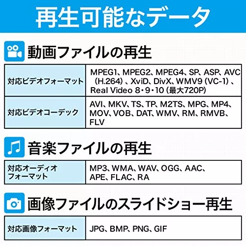 メディアプレーヤーは、どんなファイルを再生できるかは非常に重要です。フォーマットの種類が非常に多いので、しっかり確認してから購入するようにしましょう。