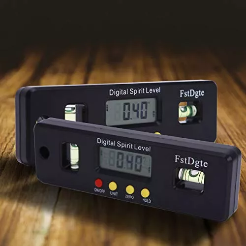 「°(度)」「%」「mm/m」「IN/FT」の4つの測定単位で傾きを表示できます。表示は読み取りやすく、単位の切替も容易です。デジタル水平器の上側には高精度の気泡管が取り付けてあるので、突然電池切れになっても慌てる必要がありません。