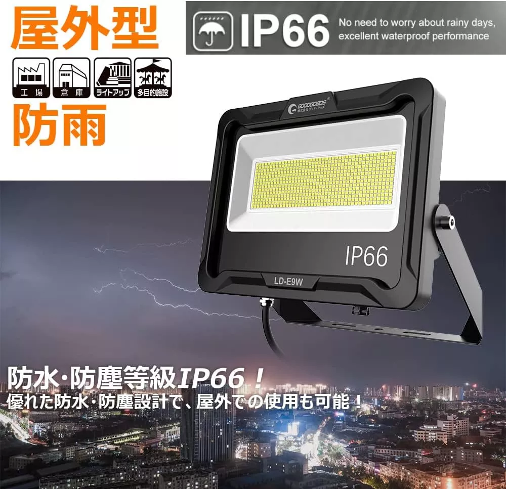 10Wなのに明るさは1000ルーメンあるコンパクトで軽いLED投光器です。発光角度は120°あるため、広い範囲を照らせます。IP66の防塵・防水レベルで、屋外でも問題なく使用できるのもポイントです。さらに、50000時間の設計寿命により交換作業の手間を減らすことも可能です。